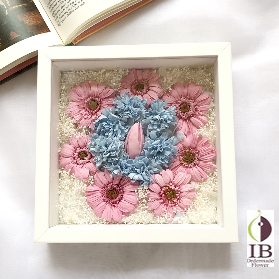 亡くなった男の子を優しく見守るご両親をお花で表現したご友人へのお悔やみのフレームを製作致しました。
