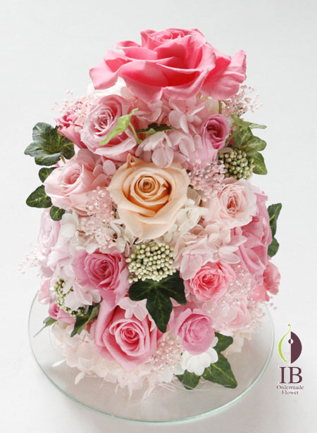 ご要望通り、ほこりの心配の要らないガラスドーム花器を使用して、お気に入りいただきました100615mj御祝のようなデザインで、バラの密度御多くした、可愛らしく華やかなイメージのお花を製作させていただきました。