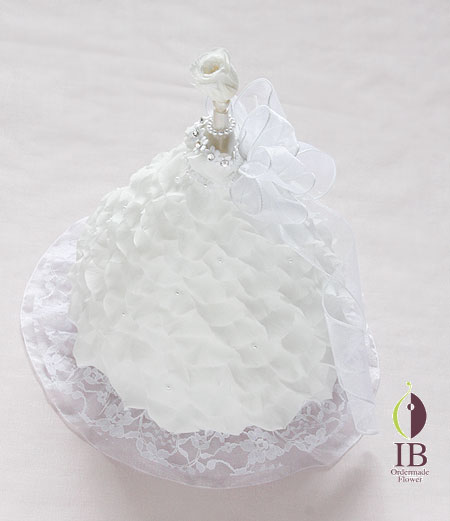 ご結婚の御祝いで、お気に入りいただきました純白のウェディングドレス21005syのようなかんじで、純白のバラの花びらを使用して、すそを長くしふんわり膨らませたウェディングドレス装飾を製作させていただきました。