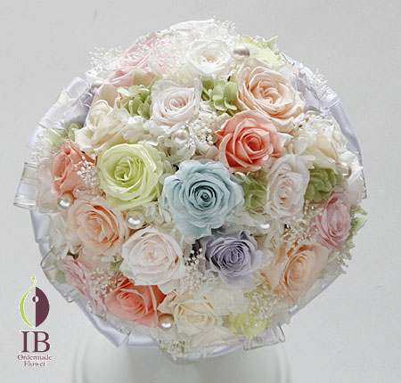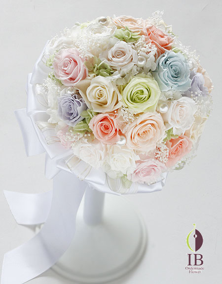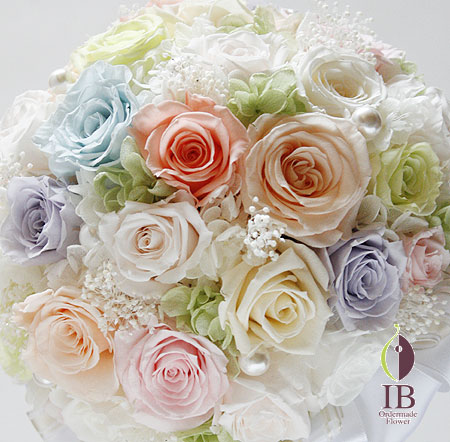 お気に入りいただきました 110513okダズンローズのような配色で、サムシングブルーバラを1輪とパステルカラー、数種の白色系バラのグラデーションで爽やかで可愛らしいボリューム感のあるラウンドブーケ、ブートニアを製作させていただきました。
