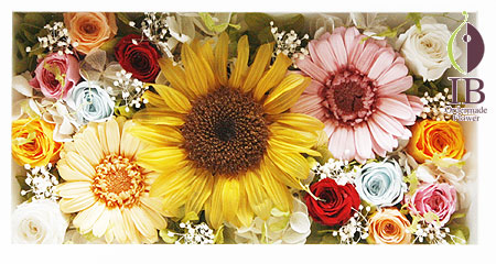 ご要望通り、花器はほこりの心配の要らないガラス付きウッドスタンドウインド長方形白を使用して、プリザーブドひまわりのお花を中心の目立つ位置にして、周りにガーベラ、赤、ピンク、オレンジ、ピーチ、ブルー、白バラをお入れして、明るく楽しい元気なイメージの還暦のお祝いのお花を製作させていただきました。
