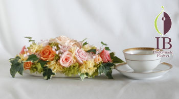 移転のお祝いで、応接室のテーブルの上にお飾りいただく横長ボート型のお花です。プリザーブドフラワークリーミィピーチを中心に配置して、周りにペールピンク、ブライダルピンク、バニラピンク、キャンディピンクを散らし、サンセットオレンジ、ピーチをアクセントに優しく柔らかい感じで仕上げさせていただきました。