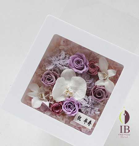 おばあちゃまの大好きな胡蝶蘭のお花を中心の目立つ位置に配置し、デンファレ、マリーゴールドパウダーライラック、ラベンダー、スイートライラックバラをお入れして、明るく清楚なイメージの卒寿のお祝いのフレーム装飾です。