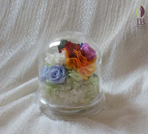 アクリルドームにレインボーローズを入れて、青と白のバラをプラスしてください