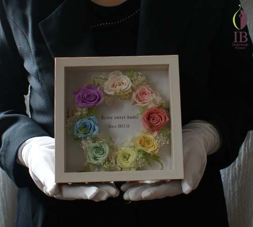 ご要望通り正方形フレームの中に、リースの形で、バラの配色を淡いレインボーカラーを使用して