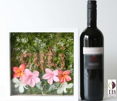 お嬢様が開店されるサロンの開店のお祝いのフレームです。南国のお花プルメリアを使用してお店の名前はカーネーションの花びらでおつくりいたしました。
