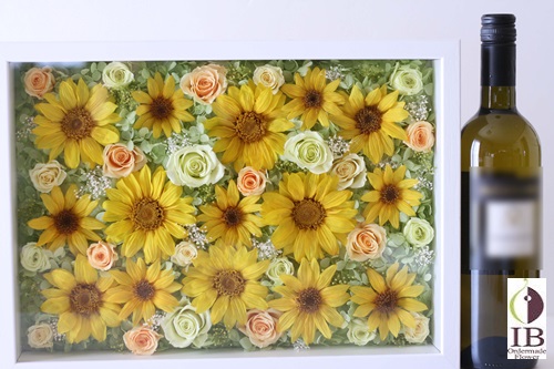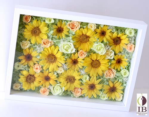 B4サイズのフレームにひまわり15輪とひまわりが引き立つように淡いバラを加えて豪華なフレーム装飾を製作させていただきました。