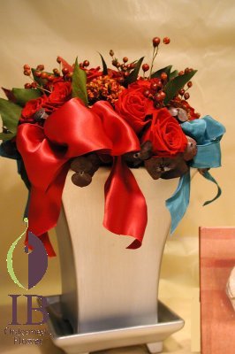 バラ(レッド)、ロワールスノーボール、フランス製リボン3種類、シルバーの花器(陶器製)