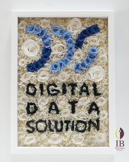 会社のロゴマークを青色の濃淡色と文字は黒色バラを使用して、フレームの中に装飾させていただきました。