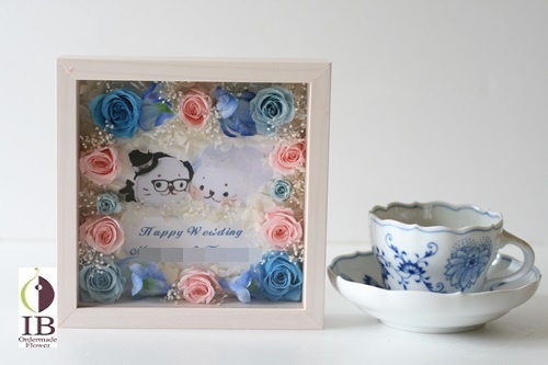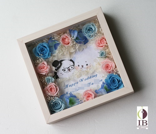 ご結婚のお祝いに新婦が大好きなしろたんのキャラクターのイラストを囲んで濃淡のブルー、ピンクのお花などで製作いたしました。可愛らしくとのご希望でございました。