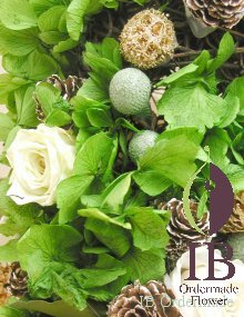 プリザーブアジサイ(グリーン)、木の実、プリザーブドローズ(ホワイト、シャンパン、フレッシュグリーン)、コンポート
