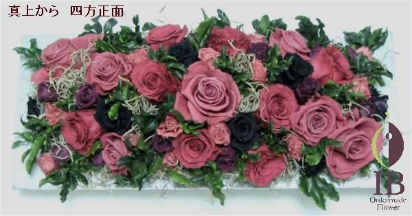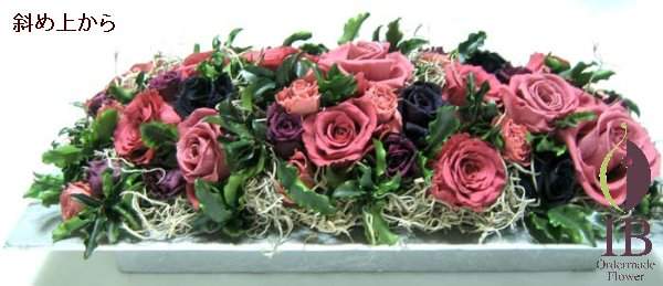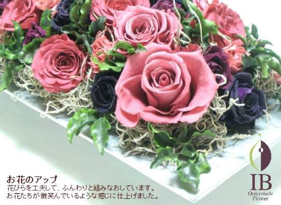 060226mh テーブルに2006年2月26日■テーブルの上に置くお花■ ■お客様からのご要望 草原に咲いているものを箱庭に詰め込んだような感じのもので、 和のセンスを取り入れてほしい ■全体の外寸 お花の部分のサイズ:横幅36×奥行き16×高さ13センチ 花器のサイズ:外寸 横幅39×奥行き17×高さ5センチ 内寸 横幅29×奥行き7×高さ5センチ ■実際にご注文いただいたご依頼主さまのご都合上、 画像のお花の価格は公表いたしかねます。 ■使用花材 ブリザードフラワー バラ(クランベリー、ルージュピンク、スウィートピンク バイオレット、うすべに)、ピットスポラム、スパニッシュモス N、アルミ長方形花器 お祝い,パープル,赤,バラ