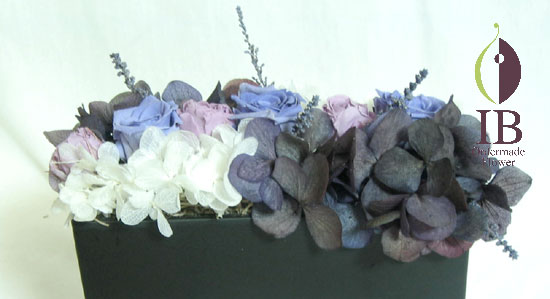 スクエア型の花器に、癒しの色パープル系のメリハリのある色でモダンな感じのイメージに仕上げました。