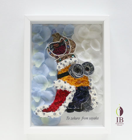 ご要望通り、花器はA4サイズフレーム白を使用して、ご指定のデザインのキャラクターミニヨンをお花で装飾させていただきました。