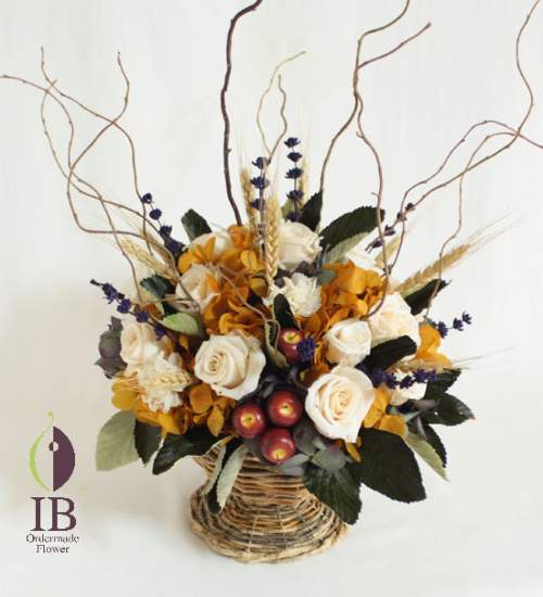 シャンパン色とマスタードの渋めの配色で、ボルドー系のアジサイをプラスして