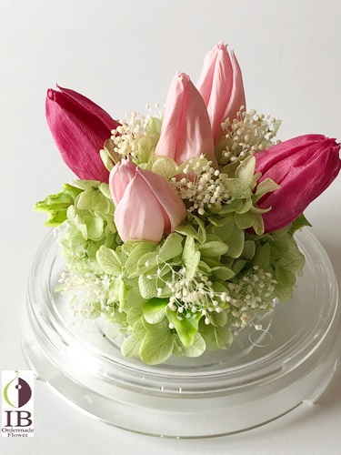 お母様の退職のお祝いにチューリップのドーム装飾を製作させていただきました。ピンクの濃淡のチューリップと淡いグリーンのアジサイと白いカスミソウで爽やかな感じに仕上げてあります。プリザーブドフラワーのチューリップは希少で高価なお花となっています。