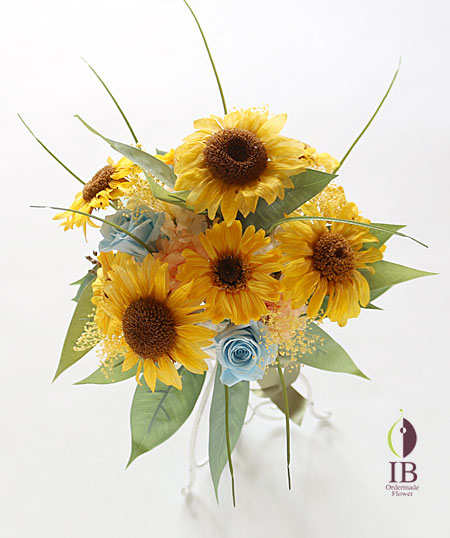 ひまわりメインでガーベライエローと挿し色にアクセントで淡い水色のバラをお入れして ラウンド型のブーケに仕上げました。