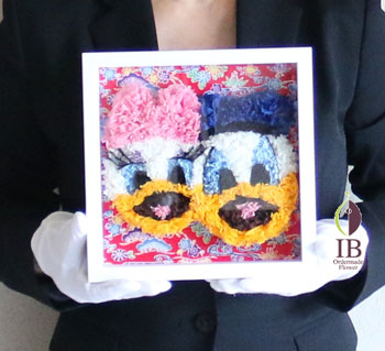 ご要望通り、花器は正方形フレーム白を使用して、ご指定のドナルドとデージーデザインをカーネーションのお花で装飾させていただきました。