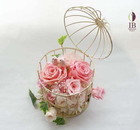お誕生日プレゼントとしてとりかご入りのアレンジをお作りいたしました。