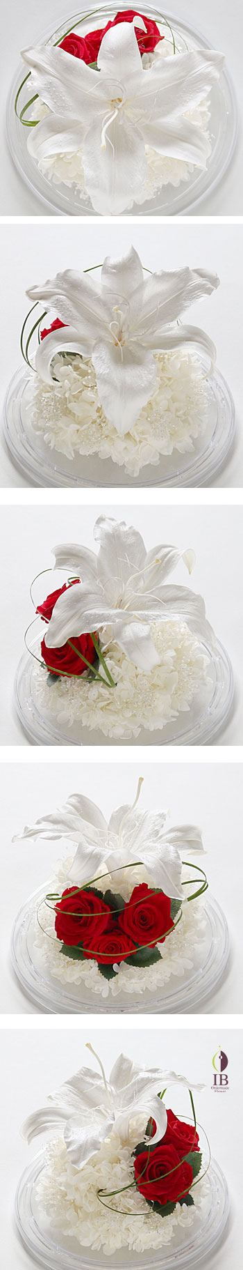 プリザーブドフラワーカサブランカは大変デリケートお花のため、ドーム花器への装飾が最適です。