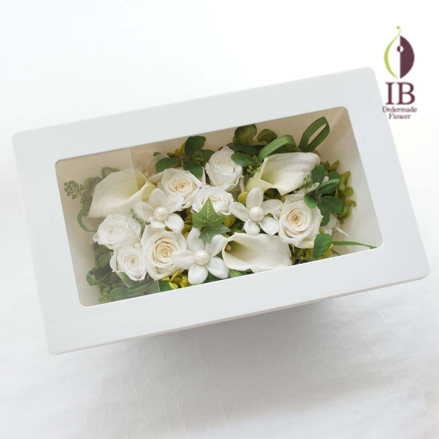 フレームタイプの正方形花器白へ、カラーの白とジャスミン白、プルメリア白のご希望を