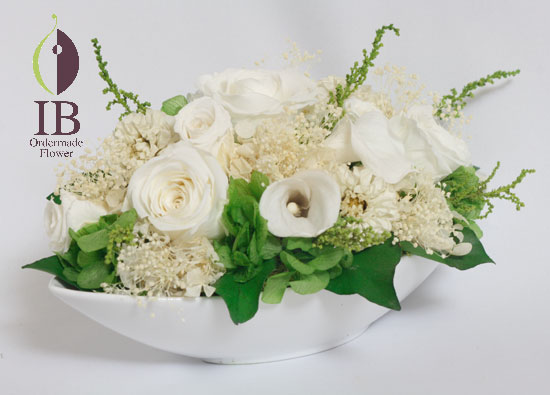 プリザードバラピュアホワイト、アイボリー、ダリア、カラーのお花と