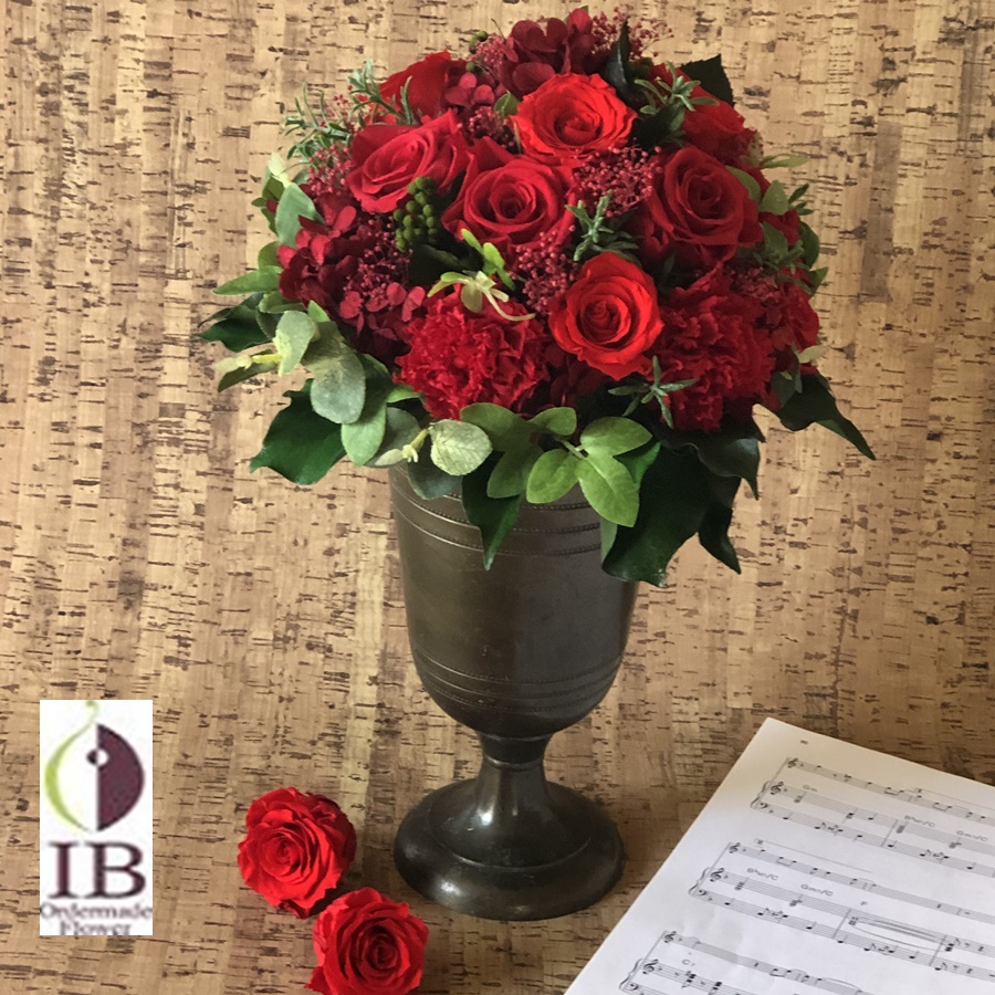 還暦のお祝いの贈り物を製作させていただきました。赤いバラ、カーネーションをメインにアジサイ、カスミソウなどで花束をおつくりいたしました。深紅のバラが引き立つように濃いグリーンのバラの葉やヘデラ、間にはアーティフィシャルフラワーのリーフを数種類入れてグリーンのバランスをとりました。