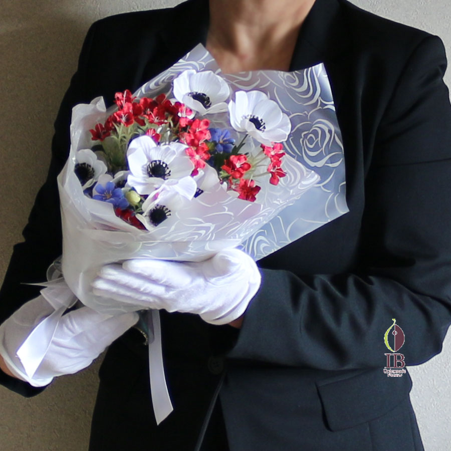お花はアーティフィシャルフラワー(造花)で、赤いナデシコ ワスレナグサ 白いアネモネを使用させていただいております。