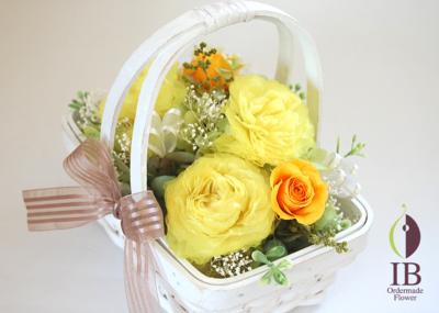 白いバスケットに、黄色いプリザーブドのラナンキュラス3輪と