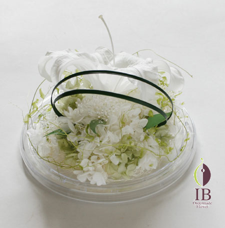 プリザーブドアジサイ白・パールグリーン、カスミソウ白ラメ