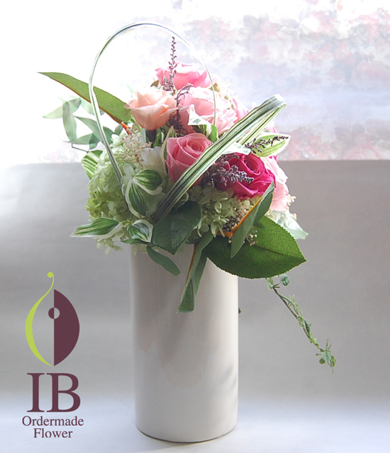 安定感があり、清楚な円柱型の花器を使用し、ピンク系のバラを美しいグラデーションのようにお使いして、華やかなお祝い花をお作りさせていただきました。